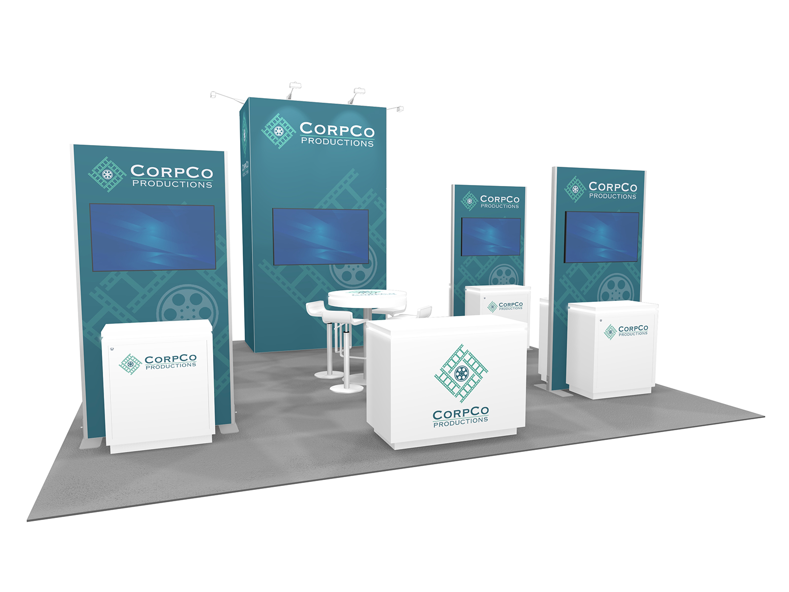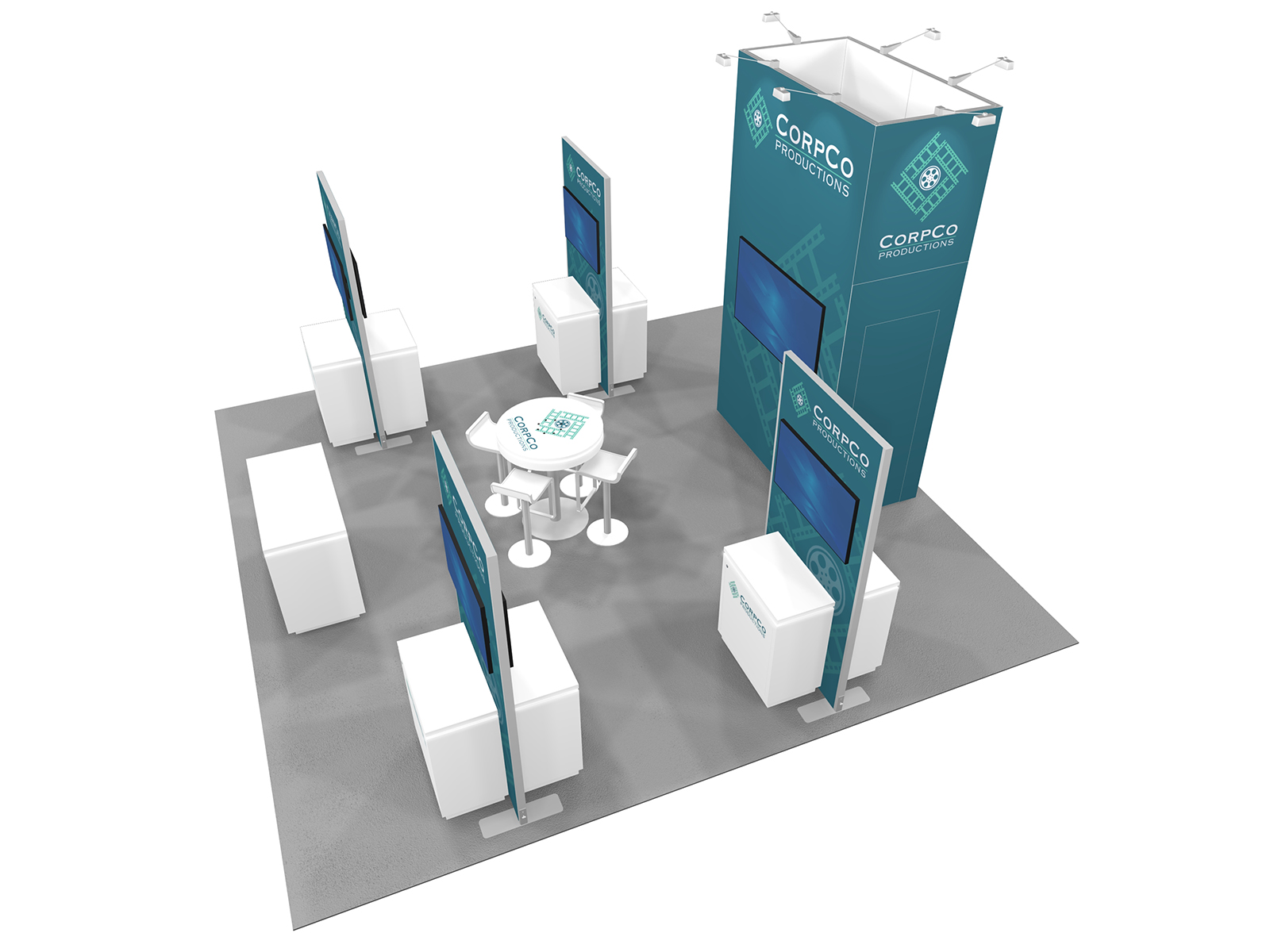 The RE-9207 on the other hand uses those same backlit graphics and demo stations but replaces a tower with a conference room. All three configurations use a variation of the same components, which is why the prices are similar. Many exhibitors want that design flexibility, even if they consistently exhibit in a 20 x 20 for example. That way, they can tailor the booth to their marketing goals and the demographics of the show audience.