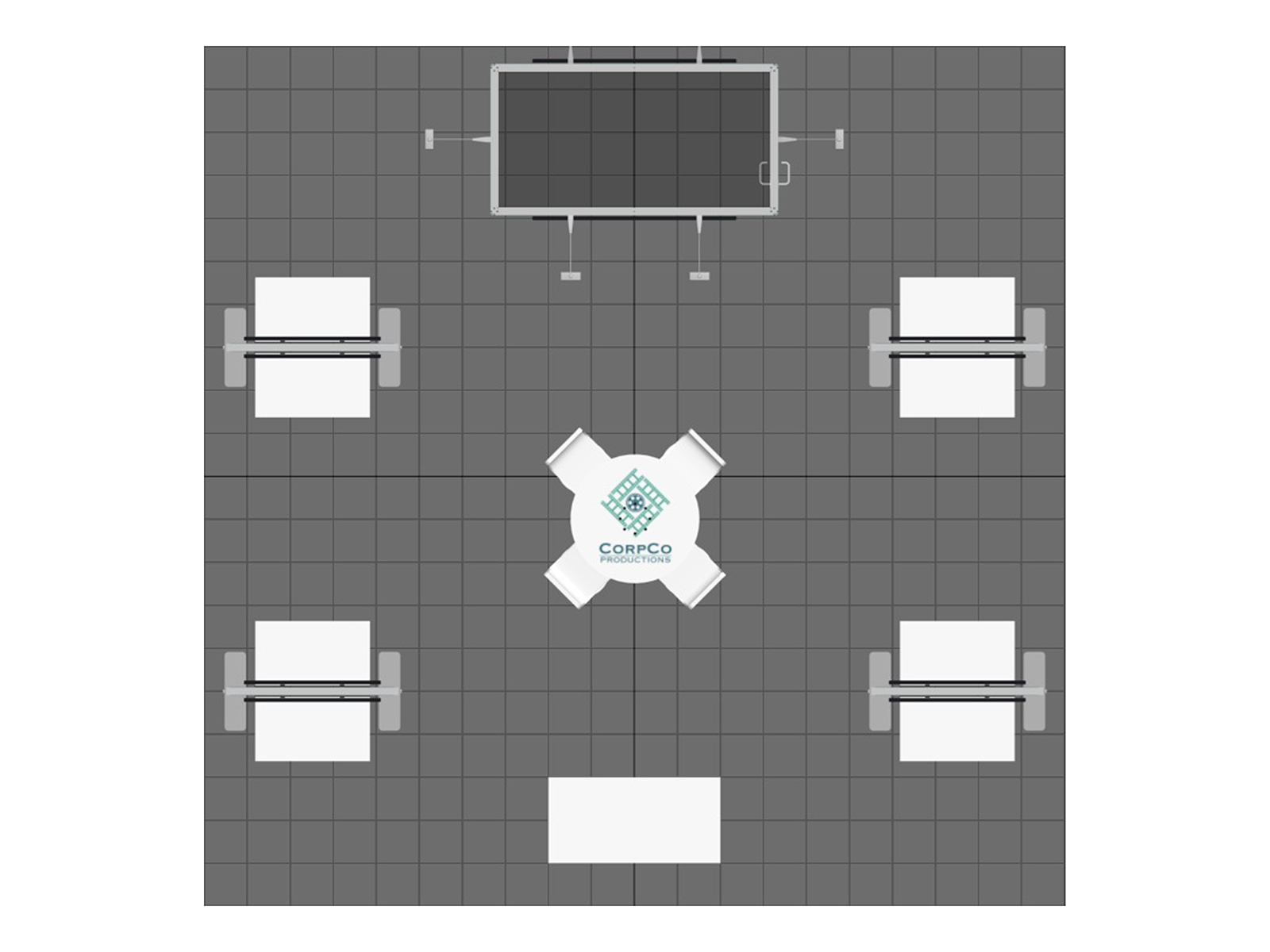 You have options when renting an island exhibit… lots of options. Even something as straightforward as the location of a tower. The RE-9206, RE-9207, and RE-9208 series illustrates this flexibility. In the RE-9208, the 12 ft. tower is positioned toward the back of the booth with forward facing demo stations, reception counter, and charging table. The RE-9206 positions the tower in the middle of the booth so backlit graphics face the aisle and demo stations are in the interior.