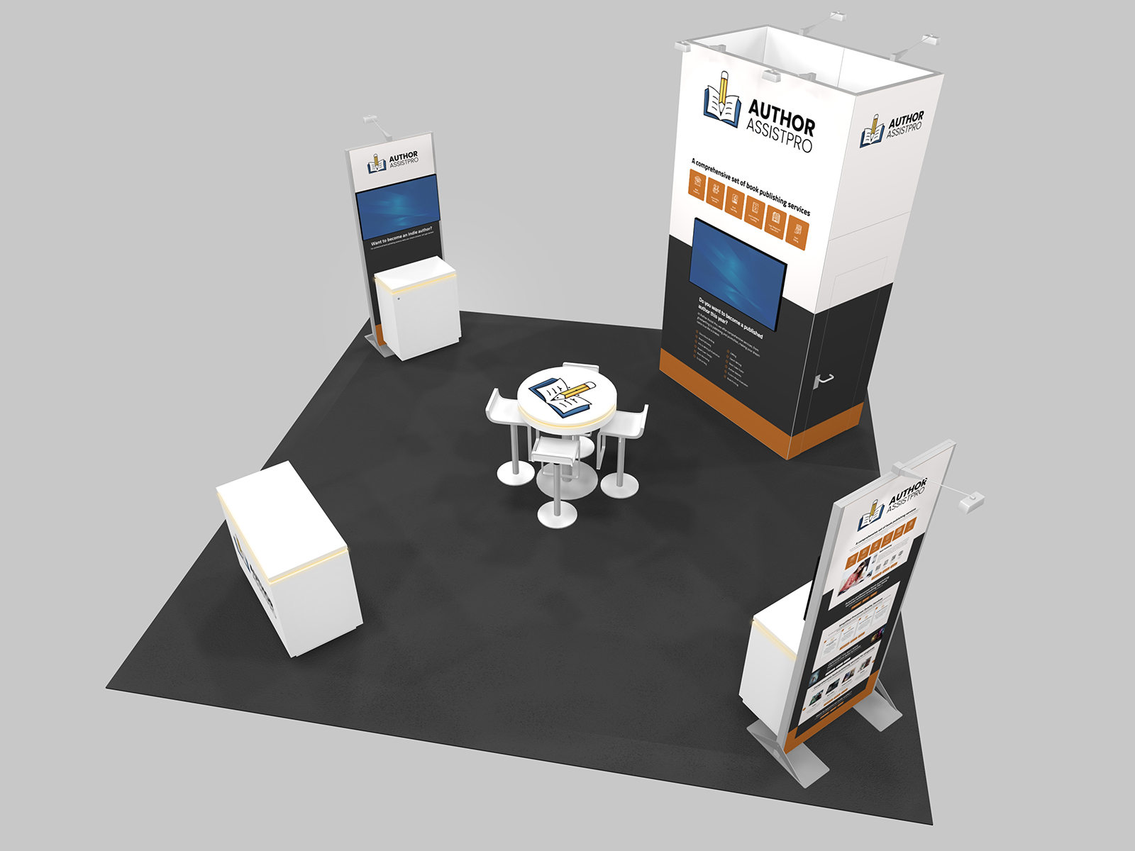Feel free to mix and match other components from our extensive rental accessory inventory, including workstations, lightboxes, literature stands, and pedestals. The Gravitee modular components assemble with tools making setup fast and easy and saving most exhibitors 30-40% on labor.
