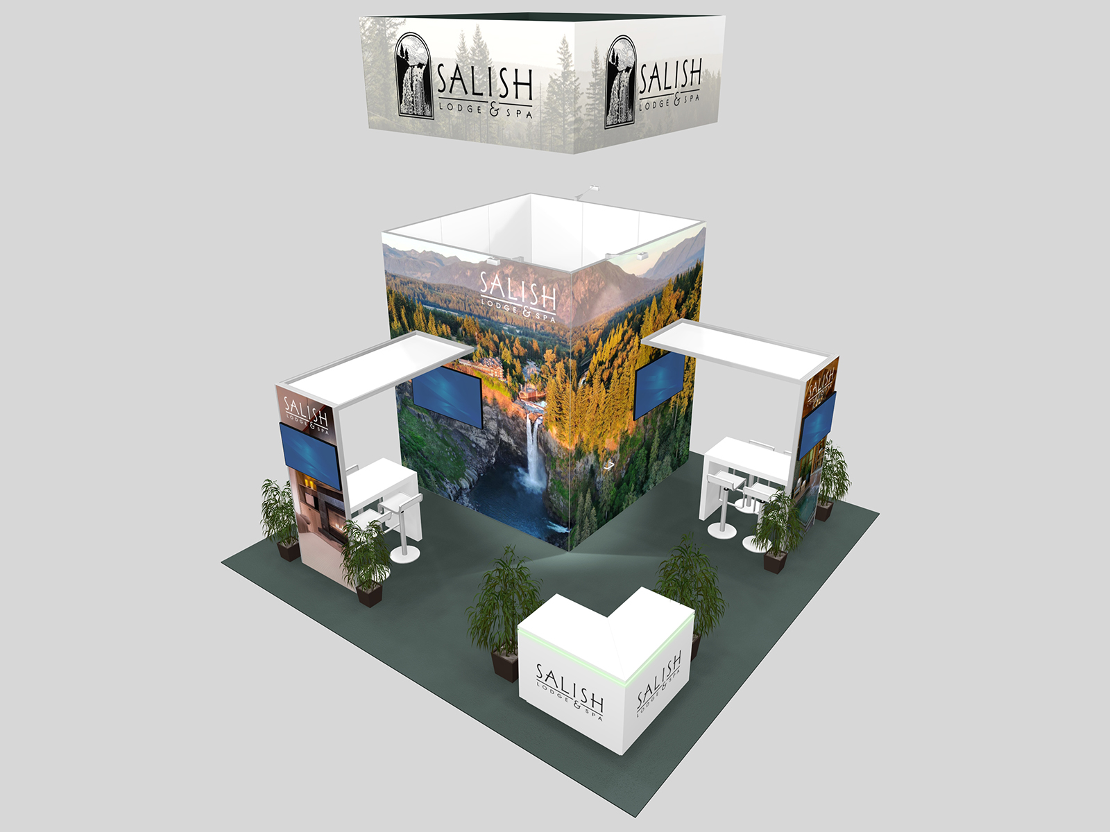 Canopies are cooler than ever before! More and more trade show island designs are incorporating canopies to add depth and dimensionality. The RE-9211, 9212, and 9214 series shows how canopies can stretch the booth space while also creating semi-private meeting areas for demos and meetings.